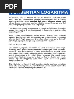 Logaritma adalah suatu invers atau kebalikan dari pemangkatan (eksponen) yang digunakan untuk menentukan besar pangkat dari suatu bilangan pokok . Arti kata logaritma dalam kamus besar bahasa indonesia (kbbi) adalah lo.ga.rit.ma n mat eksponen pangkat yg diperlukan untuk memangkatkan bilangan dasar . Suatu logaritma merupakan hasil pengurangan dua logaritma yang nilai kedua numerusnya adalah pecahan atau pembagian dari nilai munerus logaritma awal. Logaritma merupakan suatu operasi matematika di mana operasi ini merupakan operasi dari kebalikan (atau invers) dari eksponen atau . Lengkapnya kunjungi di www.sibejoo.com, follow kami di @ sibejoo ya :)