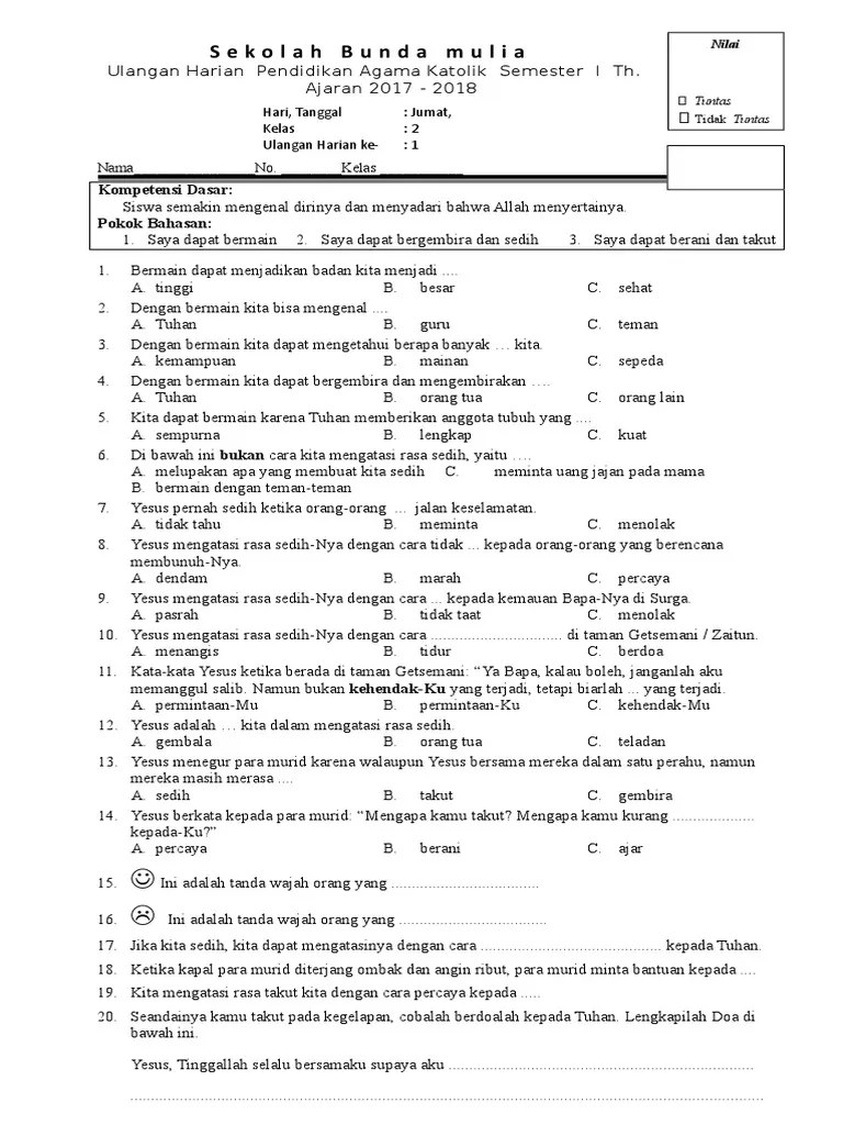 Guru sd smp sma materi agama katolik kelas xi sma k13. Soal uts agama katolik kelas 11 semester genap 2 ini bisa digunakan oleh bapak. Sual uts pai kelas i semester i pdf sekolah dasar sekolah . Pendidikan agama katolik & budi pekerti kurikulum : Orang mati yang dibangkitkan yesus adalah. (2008) kumpulan soal agama katolik untuk sd terbitan: Alam yang indah hendaknya kita lestarikan dan … Soal agama katolik kelas 5 semester 2 dan kunci jawaban. Download perangkat lengkap agama katolik kelas 5 sd k13 serta semua mata pelajaran yang dapat bapak/ibu guru unduh secara gratis sesuai revisi terbaru. Berapa hari lazarus berada di dalam kubur? Pendidikan agama katolik, klik disini · klik disini. 1, pendidikan agama islam, klik disini · klik disini. Soal uts agama katolik kelas 4 sd semester .